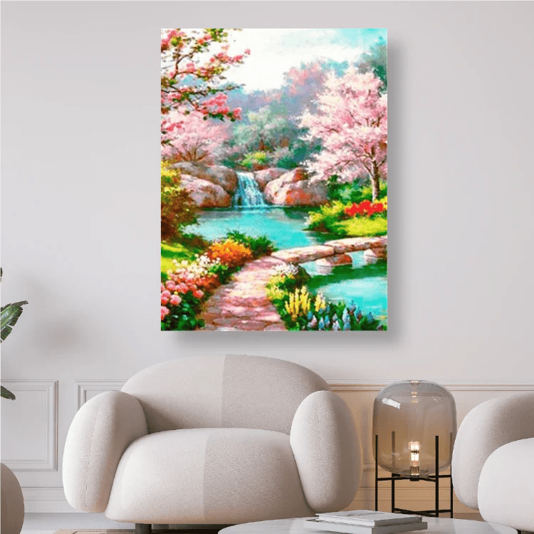 Blütenzauber die Natur erwacht, Fluss mit Wasserfall - 5D DIY Diamond Painting