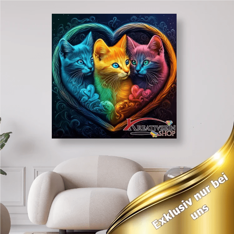 3 Katzen im bunten Herzrahmen - 5D DIY Diamond Painting