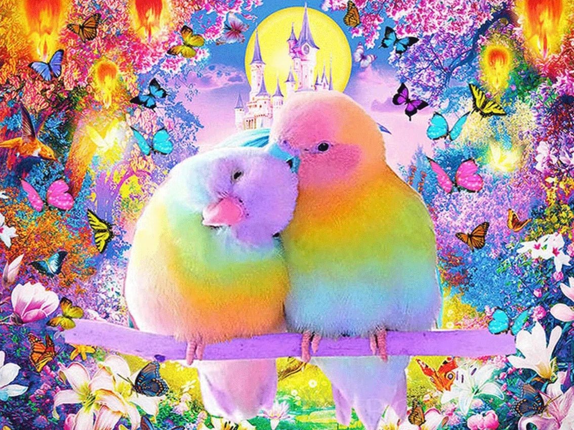 Folgende Inhalte enthält Dein Motiv ➩ Liebesvögel vor dem Dornröschenschloss - Voll AB 5D DIY Diamond Painting