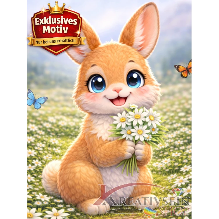 🐰 Kawaii Diamond Painting Set „Süßer Hase mit Edelweiß“ – Niedliches DIY Motiv
