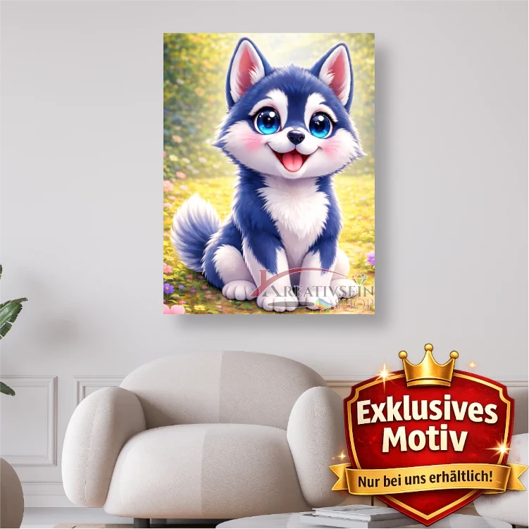 🐶 Kawaii Diamond Painting Set „Süßer Husky im Blütenfeld“ – Niedliches DIY Motiv