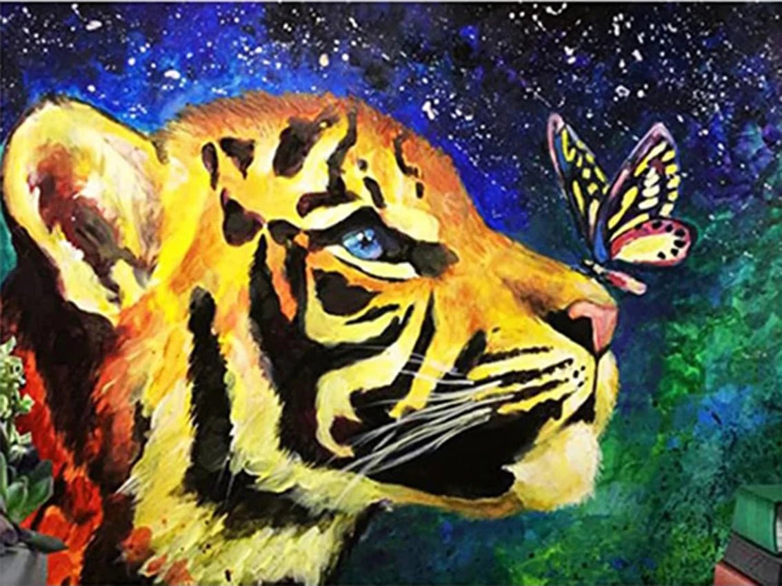 ➩ Hochwertige bedruckte Leinwand mit Deinem Wunschmotiv ➩ Kleiner Tiger mit Schmetterling - Voll AB 5D DIY Diamond Painting. (nummeriert mit Zahlen-/ Symbolcode)