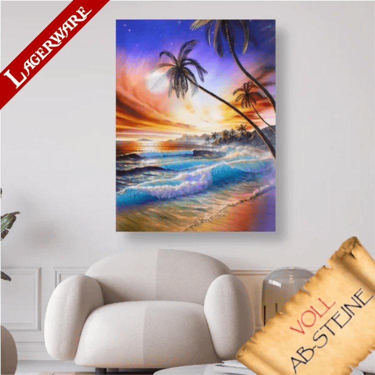 ➩ Hochwertige bedruckte Leinwand mit Deinem Wunschmotiv ➩ Sonnenuntergang am Meer mit Palmen - Voll AB 5D DIY Diamond Painting. (nummeriert mit Zahlen-/ Symbolcode)